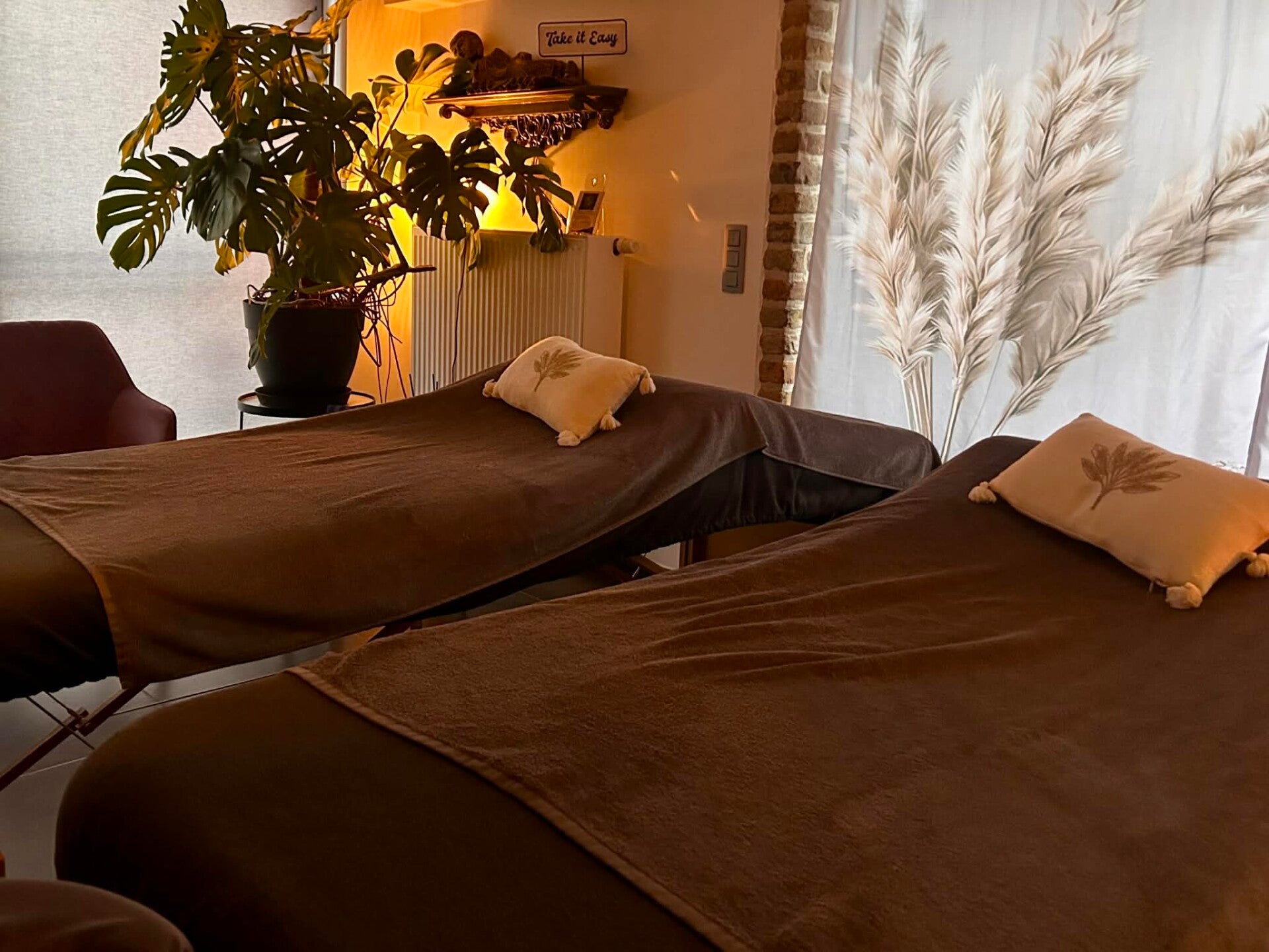 Het duo ligt naast elkaar in dezelfde ruimte (1 m afstand), we zorgen ervoor dat er helende en ontspannende muziek is, we luisteren naar de behoeftes en houden rekening met pijnlijke zones.